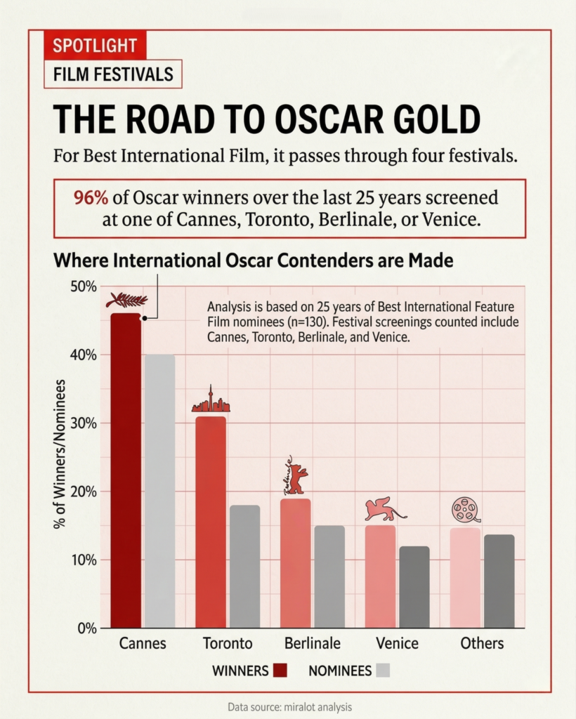 The data supports a clear conclusion. Festival placement is a leading indicator of Oscar performance in the Best International Feature category. The relationship is not absolute, but it is consistent enough to inform strategy. Where a film premieres influences how it is positioned, how it is perceived, and how effectively it can sustain a campaign through the awards cycle.